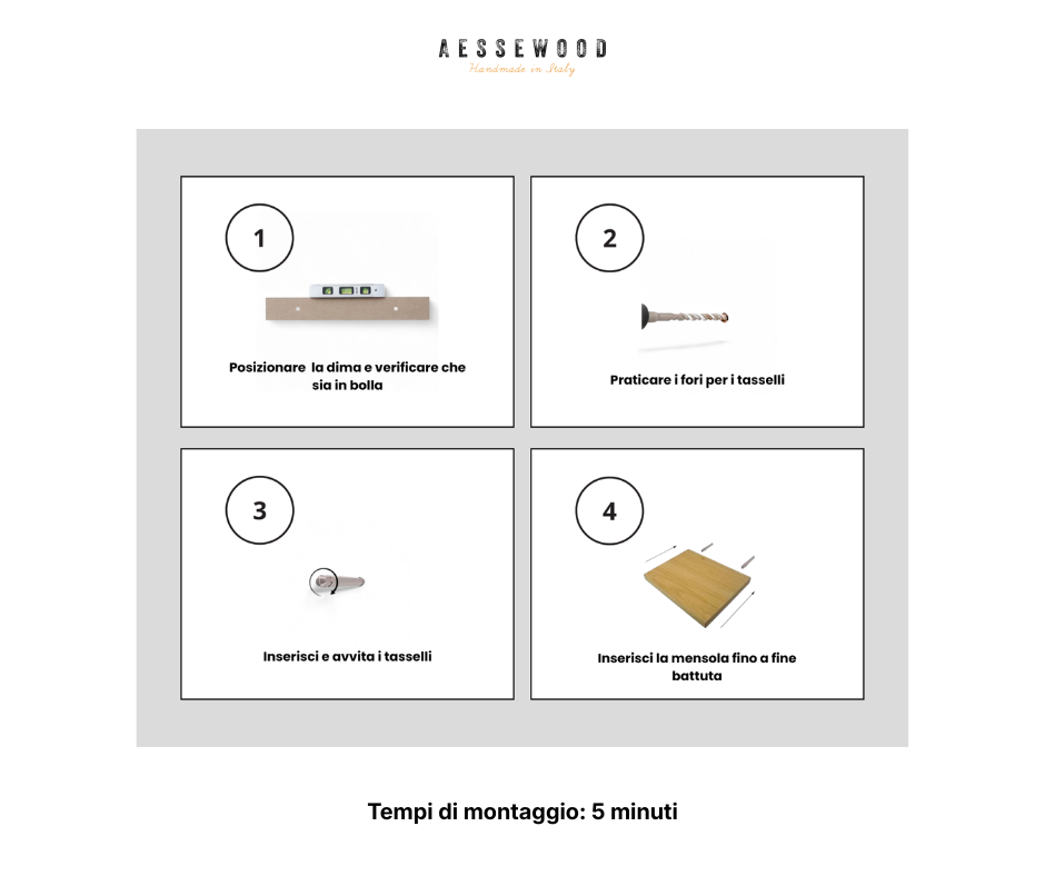 Forniamo viti e tasselli calibrati in base alla lunghezza e profondità della mensola, così da garantirti un’installazione solida, affidabile e senza complicazioni.